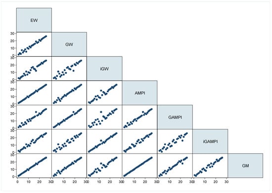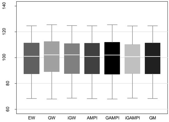 With this perspective in mind, we investigated the appropriateness of different methodologies aggregating the two elementary indexes introduced above into a composite index: (i) the arithmetic mean (EW), (ii) the Adjusted Mazziotta-Pareto index (AMPI), and (iii–vii) five modifications thereof based on distinctive weighting systems that depend on the Gini coefficient, its reciprocal value (GW, iG, GAMPI, and iGAMPI), and the geometric mean (GM). Ciommi et al. [] provided a detailed description of these methodologies. We represent our data with a matrix , whose entry represents the value of the j-th elementary indicator corresponding to the i-th country, with j = 1, 2, and i = 1, 2, …, 26. As proven by [], the following formula summarizes six methods for building the composite indicator for a given country i