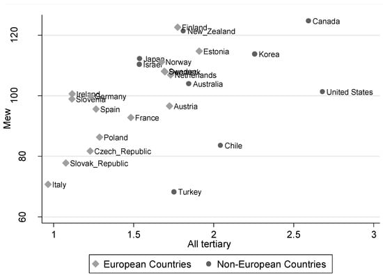 We used country-level data for 26 countries, namely Australia, Austria, Canada, Chile, Czech Republic, Denmark, Estonia, Finland, France, Germany, Greece, Ireland, Israel, Italy, Japan, Korea, Netherlands, New Zealand, Norway, Poland, Slovak Republic, Slovenia, Spain, Sweden, Turkey, and the United States. Data were derived from the Survey of Adult Skills under the OECD Programme for International Assessment of Adult Competencies (PIAAC) []. Focusing on individuals 30–44 years old, the following percent shares (in total population 30–44 years old) were calculated: (i) adults that have attained tertiary education and whose parents both have less than tertiary education; (ii) adults attaining tertiary education and who have at least one parent that attained tertiary education; (iii) adults whose parents both have no more than secondary education level; and (iv) adults who have at least one parent achieving a tertiary education degree []. Data on expenditure on educational institutions as a percentage of Gross Domestic Product (GDP) for different levels of education (with a focus on tertiary education) were finally derived from OECD official statistics.