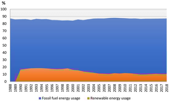 Energy is the lifeblood of the South African economy, and obtaining, processing, and disseminating energy commodities and services is a major enterprise that creates jobs and value across the economy. As a result, South Africa’s usage of nonrenewable energy sources such as fossil fuels (FF) has grown dramatically. In 2018, coal dominated the energy supply with 65% of the primary energy share; however, crude oil, renewable energy, natural gas, and nuclear energy accounted for 18%, 11%, 3%, and 2%, respectively, of South Africa’s energy supply (South African Energy Sector report, 2021) [31]. In addition to that, Figure 1 shows that fossil fuel energy consumption is the primary energy source in South Africa when compared to renewable energy consumption.