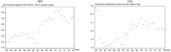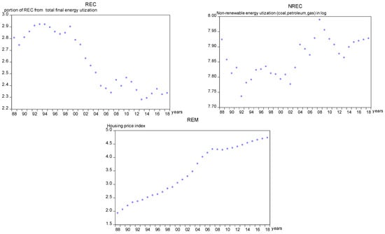 in Equation (1) above, represents South Africa’s carbon emissions, and represents the real estate market index. GDP in USD (2010 = 100). represents the proportion of RE (“renewable energy utilization from the total energy utilization”). represents total non-RE (“non-renewable energy utilization such as coal, petroleum, gas, etc.”). The entire series was transformed into a natural logarithm. Figure 2 shows the time series plot of the series at the natural logarithm, indicating various economic fluctuations and policy changes in South Africa. The data examined in the study ranges from 1988 to 2018. Table 1 contains information on the targeted data’s origin and description.