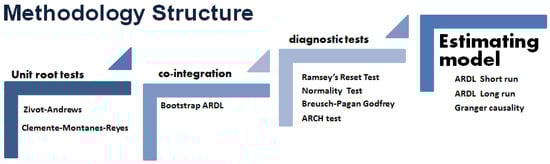 where ∆ means the “first difference” and is the lagged ECT. Causation among series in the short run is assessed using the “Wald test (F) statistics”. Figure 3 depicts the structure of this paper’s econometric methodology.
