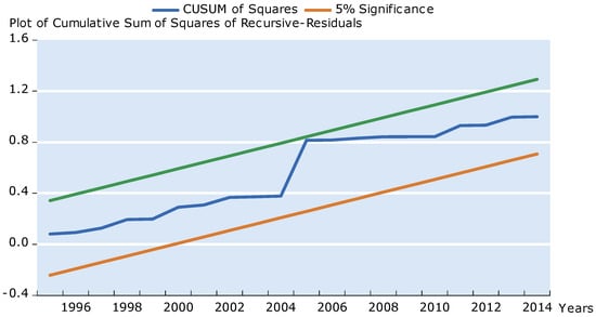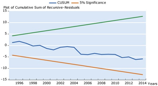 To reinforce that empirical analysis is performed correctly, the final article employs some diagnostic evaluations, namely, the “Ramsey RESET” test; and the “Autoregressive Conditional Heteroskedasticity” (ARCH test, the normality test, and the Breush–Pagan–Godfrey heteroskedasticity test. Otherwise, the study utilized the “CUSUM and CUSUM-square” assessments to reinforce that the empirical analysis is tested correctly. To determine the short- and long-term causal relations that exist among the series, the “Granger causality” analysis is employed. In this analysis, () defines the variations of short-term level variations from long-run symmetry. The is presented in Equations (3–7):