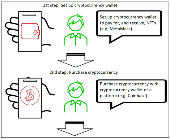 The four successful business models utilizing NFTs are as follows: Firstly, someone that creates an NFT; secondly, an NFT marketplace offering them for sale; thirdly, fan tokens; and lastly, online games with virtual items minted as NFTs [13]. Most NFTs are purchased from dedicated NFT marketplaces such as OpenSea (OpenSea.io) and Binance NFT Marketplace (www.binance.com/en/nft, accessed on 1 October 2022). These marketplaces host the NFTs but the buyer still needs to have a cryptocurrency wallet to use them. For example, OpenSea allows approximately 15 cryptocurrency wallets including MetaMask and Coinbase Wallet. A cryptocurrency wallet is a digital equivalent of a wallet, and it is used to store and use cryptocurrencies and NFTs. An NFT marketplace is a website that enables consumers to purchase NFTs.