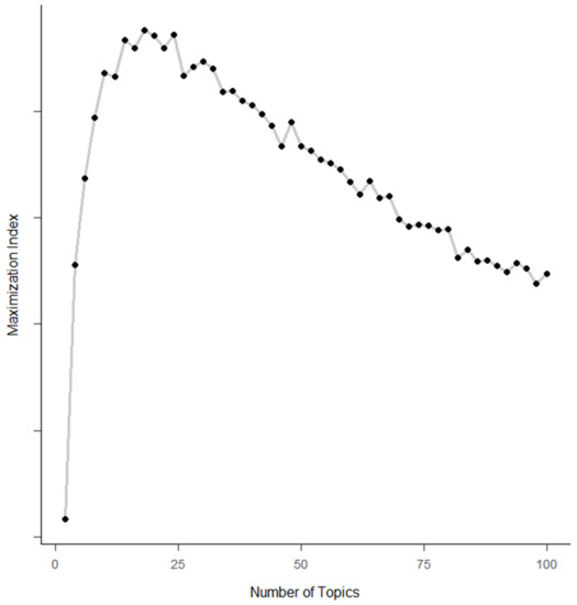 The validity of the LDA results depends on the quality of the input data. Our analysis followed best practices recommended by Maier and colleagues [28], who detailed a sequence of specific steps to increase the validity and interpretation of modeling results. Briefly, the first step was to prepare the textual data by tokenizing words, removing punctuation, special characters, and stop-words, and reducing each word to its word stem. Next, we used a maximization algorithm to determine the optimal number of topics that characterized the document corpus [41]. The optimal number of topics was identified when the algorithm estimation peaked, suggesting that no substantial improvement would be made by adding more topics. As seen in Figure 2, the maximization index peaked near 20 to 25 topics. It is not uncommon for the maximization algorithm to suggest a range of optimal topics. When that occurs, researchers are advised to use the lower end of the range in the interest of parsimony. Hence, we determined that the sampled reports of unusual environmental events were best represented with 20 topics.