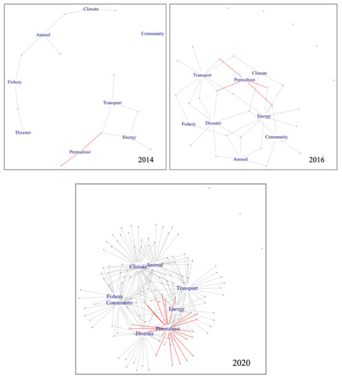 Next, we assessed the importance of the topics and their trajectories over time, leveraging network analysis. Figure 3 shows the topic–document networks in 2014, 2016, and 2020. Over time, more reports were submitted to the LEO network, suggesting increasing community participation in environmental monitoring. Furthermore, the networks became densely connected, transforming from a system where there were two disconnected subgroups of topics in 2014 to a system where every topic was mutually connected through multiple documents in 2020. To illustrate this transformation, we examined the changes in the pattern of connections associated with the topic of permafrost. As seen in Figure 3, the topic of permafrost was only connected to two other topics (i.e., transportation and energy) in 2014. In the network of 2016, the topic of permafrost was connected to the topics of community life and natural disasters, in addition to the topics of transportation and energy. In a more recent network of 2020, permafrost was closely connected to every other topic we identified in the corpus of documents. As different environmental challenges in the Arctic have become connected, small perturbations in one environmental sphere may spread to affect or co-vary with other spheres via multiple pathways, increasing the likelihood of system-wide changes. Nelson and colleagues [47] defined resiliency as “the amount of change a system can undergo and still retain the same controls on function and structure while maintaining options to develop” (p. 398). The dense interconnections among environmental concerns, as reflected in the community monitoring reports, indicate that communities face an increasingly intertwined set of environmental challenges. This necessitates closer monitoring of the interaction between different environmental concerns and more research on increasing communities’ resiliency to challenges.