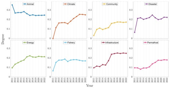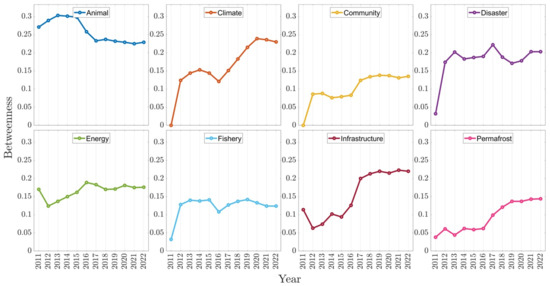 Finally, we plotted the trend of network centrality for each topic. As seen in Figure 4 and Figure 5, all of the topics—except the topic of animal behavior—witnessed an increase in degree and betweenness centrality over time, although the patterns of increase varied by topic. The topics related to climate change, energy, and permafrost experienced a gradual increase in network centrality, suggesting that these topics had a steady growth in both the number of documents that directly described them and the number of documents that described other topics indirectly related to them. By contrast, the centrality scores for the topics of natural disasters and fisheries experienced an increase before 2014 but remained steady afterward. This means that community attention to these topics grew substantially in earlier years and has remained high since then. Despite a small decrease in centrality scores, animal behavior remained a prominent issue in the reports from community environmental monitoring in the Arctic over the years.