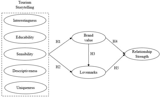 According to Roberts [21], to form a lovemarks, which can be called tourists’ attachment to tourist attractions, new and interesting storytelling must exist, and only continuous innovation can interest tourists and make them feel intimate. In addition, through storytelling, tourists communicate with each other, feel bonds or empathy, and as a result, intimacy is formed, making it easier to form a lovemarks. Yang et al. [45] investigated whether the lovemarks of tourist attractions can vary depending on the storytelling elements. They argued that emotional sensitivity, education, uniqueness, socio-culturalism, descriptiveness and interest are measured as six important factors in this process. In particular, they agreed that the descriptive story claimed by Brewer and Liechtemstein [66] helps induce a strong image. The authors further stated that if storytelling for emotional experiences is provided, tourists will be connected to emotions, and the tourist destination will form a strong lovemarks. Looking at the existing literature, it can be suggested that tourism storytelling attributes have a positive effect on the lovemarks of tourist attractions. Accordingly, the following hypothesis was established based on previous studies: