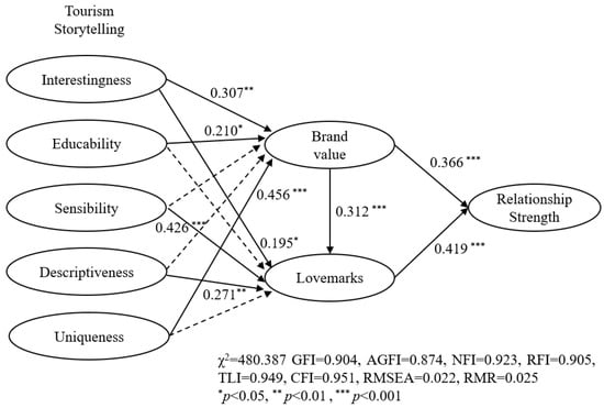 The results of the analysis of Hypothesis 1 show that being interesting (H1_1, β = 0.307, CR = 3.201, p < 0.01), educability (H1_2, β = 0.210, CR = 1.966, p < 0.05), and uniqueness (H1_5, = 0.456, CR = 0.451) all have a significant impact on brand value. The analysis of influence of tourism storytelling on brand value indicates that uniqueness (β = 0.456), being interesting (β = 0.307) and educability (β = 0.210) have a statistically significant and positive impact on brand value. On the other hand, sensibility and descriptiveness are not statistically significant (p > 0.05). Therefore, Hypothesis 1 is partially accepted. The test results of Hypothesis 2 are as follows: Being interesting (H2_1, β = 0.195, CR = 2.164, p < 0.05), sensibility (H1_3, β = 0.426, CR = 4.457, p < 0.001), descriptiveness (H1_4, β = 0.271, CR = 3.148, p < 0.01) all showed positive and significant impact on lovemarks. The test of the influence of tourism storytelling on lovemarks was in the order of sensibility (β = 0.426), descriptiveness (β = 0.271), being interesting (β = 0.195), which all have a significant impact on lovemarks. Nonetheless, whereas uniqueness (H2_5, β = −0.174, CR = −2.037, p = 0.05) is statistically significant, the direction of the coefficient of correlations is reversed, thus rejected. Educability is not statistically significant (p > 0.05). Therefore, Hypothesis 2 is partially accepted.