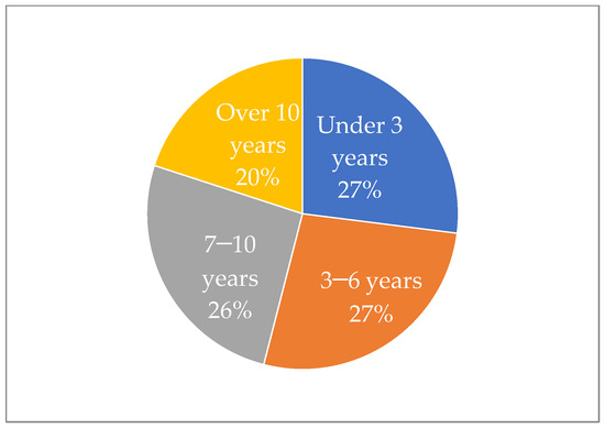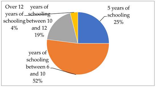 Regarding the educational level, Figure 4 shows that more than half of the respondents had between 6 and 10 years of schooling, accounting for 52%. Most households in the Phong Dien district could update information about the market with advanced knowledge to upgrade their family’s tourism development. In addition, respondents with high school and bachelor/postgraduate degrees accounted for only 19% and 4%, respectively, showing that people who engaged in tourism activities in Phong Dien did not have much professional or advanced knowledge to develop the local tourism industry. However, a quarter of household heads with less than 5 years of schooling need to be informed and imparted basic and adequate knowledge about tourism development activities.