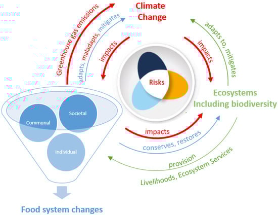 Conceptual framework of food systems and climate change. Source adopted from Pörtner et al. (2022) [1] and modified by the authors.