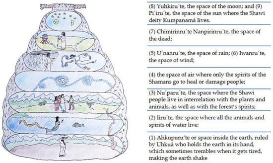 Spiritualism is a cornerstone of the Shawi worldview and is key to understanding their relationship with nature [48,50,51]. Traditionally, the Shawi understand the world as being “round as a honeycomb wasp” with nine specific spaces ruled by sentient spirits (Figure 3). The third space is Nu´paru´te, where the Shawi people live in harmony with plants, animals, and the forest‘s spirits [50]. The Shawi understand that their relationship with every spirit (mountains, trees, plants, etc.) must be in balance to live well; diseases and ecological changes are, therefore, sometimes understood as a punishment for breaking this balance [47,48,50,52,53].