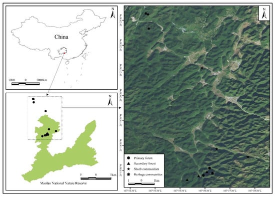 The study area was located in the Maolan National Nature Reserve (107°52′10″–108°5′40″ E, 25°09′20″–25°20′50″ N), Guizhou province, China. The average elevation ranges from 550 to 850 m above sea level. The area has a subtropical humid climate with an average annual temperature of 15.3 °C. The average annual precipitation reaches 1752.5 mm, with an average annual relative humidity of 83%. The studied area is characterized by a typical karst landscape, including a series of typical peak cluster–depression habitat types, from mountain tops and hillsides to depressions [], with over 80% of the rock being exposed []. The forest land is rarely covered by a shallow layer of soil, which is mostly retained in the rock fissures. The soil is rich in calcium and organic matter, and has high degree of basification. The soil is mainly dark or brown calcareous soil developed over carbonate rocks. The forest coverage rate is 87.4%, and the main type of vegetation is evergreen and deciduous, broad–leaved, mixed forest. The area has the largest, most unique and relatively stable karst forest ecosystem remaining in the world at the same latitude [].