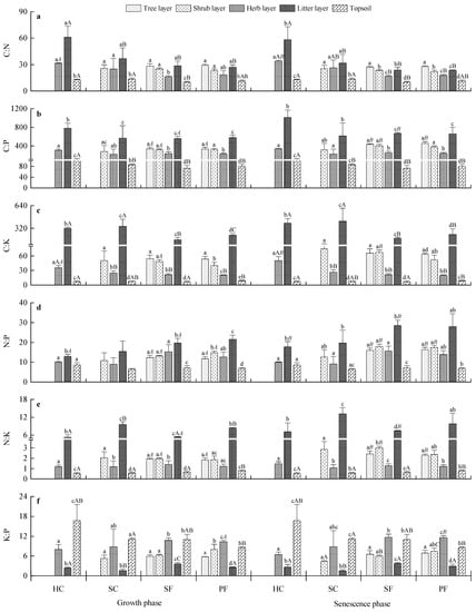 The C:N, C:P, C:K, N:P and N:K ratios in different compositions of each community decrease in the following order at both growth and senescence phases: litter layer > plant layer > soil layer (the C:N ratio is the highest in the tree layer except that in SF and PF), with a significant difference in–between. The C:P and C:K ratios at different community compositions for SF and PF are notably higher in the tree layer and the shrub layer than in the herbaceous layer at all growth stages, while the N:P and N:K ratios are the highest in the shrub layer (Figure 2a–e). The K:P ratio in different compositions of the communities HC and SC decrease in the following order at all growth stages: soil layer > plant layer > litter layer, with a significant difference between the soil layer and the litter layer; both the plant layer and the soil layer have a higher K:P ratio than the other layers in the SF community. The K:P ratio in community PF decreases in the following order at all the growth stages: plant layer > soil layer > shrub layer > tree layer > litter layer (Figure 2f).