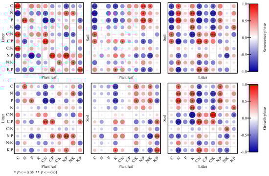 Correlation of C, N, P and K contents in plant leaf, litter and soil and their stoichiometric characteristics during vegetation succession. The scale on the right represents the size of the correlation coefficient, while red represents a positive correlation, and blue represents a negative correlation; the larger the circle, the stronger the correlation.