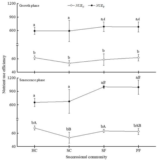 The N– and P–use efficiency of different successional communities. The abbreviations HC, SC, SF and PF represent herbaceous communities, shrub communities, secondary forest communities and primary forest communities, respectively. The subscript “N” in NUEN refers to the nitrogen (N)–use efficiency, and the subscript “P” in NUEP refers to the phosphorus (P)–use efficiency. The different small letters denote a significant difference between N– and P–use efficiency of the same community and in the same growth stage; different capital letters denote a significant difference between different communities with same nutrient elements and at the same growth stage; different capital letters in italics denote a significant difference between different growth stages with the same nutrient element and in the same community (p < 0.05).