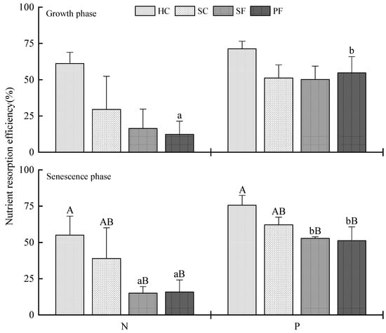 The N– and P–resorption efficiency of different successional communities. The abbreviations HC, SC, SF and PF represent herbaceous communities, shrub communities, secondary forest communities and primary forest communities, respectively. The different small letters denote a significant difference between the N– and P–resorption efficiency of the same community in the same growth stage; different capital letters denote a significant difference (p < 0.05) between different communities with the same nutrient element and in the same growth stage.