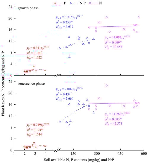 According to the threshold [] determined by Jonas Persson et al. for the homeostasis index (H), with the variation in the available N and P contents and N:P ratio in soil during the vegetation succession, no significant linear correlation was found using the homeostasis model (p > 0.1, Figure 6) between the N content in leaf at all growth stages, N:P ratio in the growth phase and the P content in the senescence phase. The homeostasis index (H) was “absolute homeostatic”. However, a significant linear correlation (p < 0.1) was found between the P content in leaf in the growth phase and N:P ratio in the senescence phase. The homeostasis index H was 1.622 for the leaf P content in the growth phase, falling into the type of “weak sensitive”; the homeostasis index H was 2.660 for N:P ratio in the senescence phase, falling into the type of “weak homeostatic”. In terms of the different nutrient elements, homeostasis between the N content and N:P ratio in leaf in the growth phase was much more significant than the P content, while the homeostasis of the N and P contents in leaf in the senescence phase was more significant than that of N:P ratio. In terms of the different growth stages, the homeostasis of the N and P contents in leaf in the senescence phase was more significant than that in the growth phase, while the opposite was found in the case of the N:P ratio.