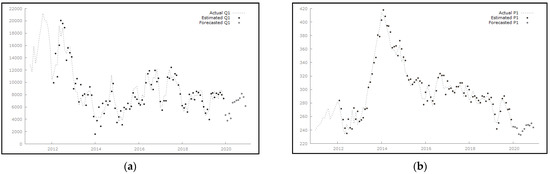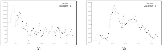 To consider the measuring forecast accuracy of the forecasting models (1)–(4), the correlation coefficient (r) in terms of percentage is used for comparing the estimated value to the actual value. It is found that the estimated SARIMA(p,d,q)(P,D,Q)s can explain the variables of Q1, P1, Q2, and P2 at 92.955%, 96.830%, 95.039%, and 96.942%, respectively. The comparisons between the actual and estimated value are displayed in Figure 2.