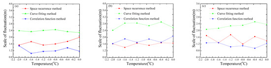 Horizontal fluctuation scales of different thermal parameters for the same calculation method. (a) space recurrence method; (b) curve fitting method; (c) correlation function method.
