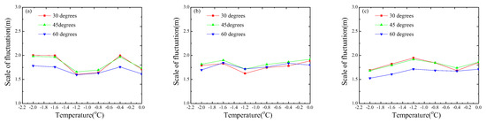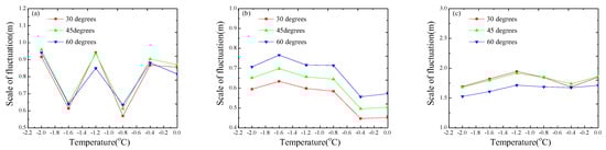 Based on the vertical and horizontal fluctuation scale of uncertain thermal parameters, the oblique fluctuation scale has great reference and application significance for the heat transfer process of artificially frozen soil around the oblique freezing pipe. It can be seen from Equation (9) that the calculation process of the oblique fluctuation scale is based on vertical and horizontal fluctuation scales. With the basic formula of the ellipse and the transformation of the trigonometric function, the oblique fluctuation scale can be obtained. Figure 6, Figure 7 and Figure 8 show the oblique fluctuation scale of thermal conductivity, thermal diffusivity, and volumetric heat capacity for the spatial recurrence method, curve fitting method, and correlation function method. It can be seen that the fluctuation range of uncertain thermal parameters for 30, 45, and 60 degrees is not invariable. The oblique fluctuation scale is between the horizontal and vertical scale of fluctuation, which accords with the actual situation of the soil. The oblique fluctuation scale of thermal conductivity calculated by the correlation function method is smaller than that calculated by the spatial recursion method and curve fitting method. The oblique fluctuation scale of thermal diffusivity calculated by the spatial recursion method is in the middle of the curve fitting method and correlation function method. The oblique fluctuation scale of volumetric heat capacity by the spatial recursion method is smaller than that calculated by the curve fitting method and correlation function method. At different temperatures, the scale of fluctuation of thermal conductivity, thermal diffusivity, and volumetric heat capacity has a consistent trend. In the case of three angles, the fluctuation scale of the dip angle always fluctuates between horizontal and vertical fluctuation ranges, which do not exceed its limit value. It fits well with the characteristics of the elliptic model.