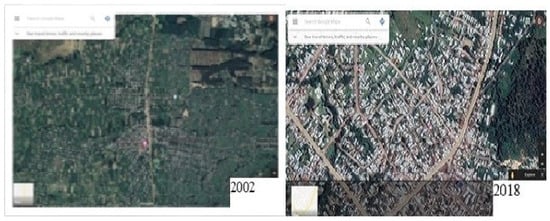It is evident that there is a clear impact of urbanization on LULCC through expansion of towns and cities on surrounding cultivated land. A study by Dewanand Yamaguchi [57] about the analysis of the LULCC in Dhaka over time revealed a considerable increase in the built-up areas by 6132 ha over the study period between 1975 and 1992, with an average of more than 360 ha yr−1. Similarly, there was an increment of 4422 ha in Dhaka from 1992 to 2003 of built-up area with an average of more than 400 ha yr−1. Arowolo and Deng [58] indicated that there is negative relationship between cultivated land expansion and distance to roads demonstrated the importance of road infrastructure on agricultural development.