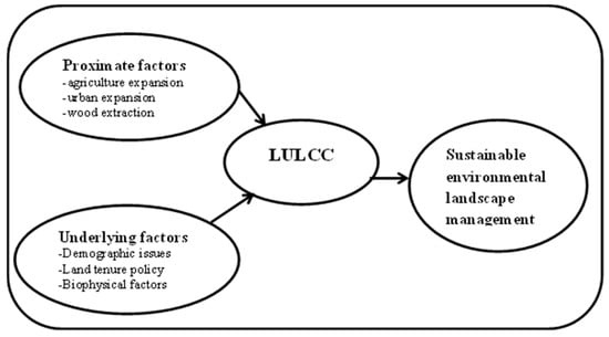 There are possible drivers of LULCC. The classification of these drivers could be seen in different ways. LULCC is triggered by the interaction of complex driving factors including a set of political, social, economic and biophysical factors [62,63]. Different researchers such as Degife et al. [64] have put the reasons for LULCC in different broad categories as proximate (direct) or underlying (indirect/root causes). Agricultural activities, wood extraction and infrastructure extension are of proximate drivers of LULCC while sets of technological, economic, demographic, political, institutional and socio-cultural factors are few of them among underlying drivers of LULCC [57,65,66].