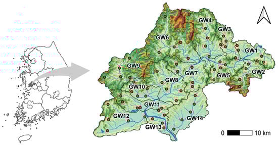 We selected 14 sub-watershed areas from the Geum River Basin, which is one of the largest rivers in South Korea (Figure 1). Each sub-watershed area consisted of five collection sites. Adult male frogs were collected during their breeding season from May to July 2020. Three frogs were collected from each site resulting in a total of two hundred and ten frogs. The collected frogs were euthanized by pithing and stored in 70% ethanol. Muscle samples from the femur were collected, and skeletal morphology was analyzed using X-ray. All procedures of animal collection, experimentation, euthanasia, storage, and disposal were performed in accordance with the regulations and with the approval of the Experimental Animal Ethics Committee of Kongju National University (KNU_2019-01).