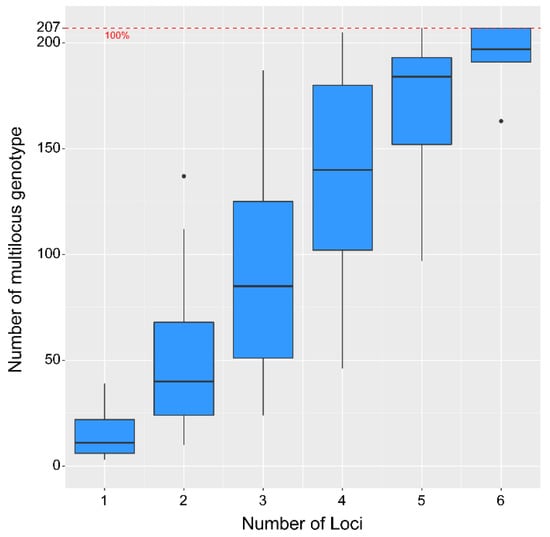 The number of multilocus genotypes (MLG) based on the number of combined loci from 210 black-spotted pond frogs. When we included six or more loci, the 207 individuals could be separated with a 100% accuracy. The central square dot indicates the mean value, the central line indicates the median value, the bottom box indicates the 25th percentile value, the top box indicates the 75th percentile value, the bottom and top of line indicate the range within 1.5 interquartile, and the circles indicate the outlier.