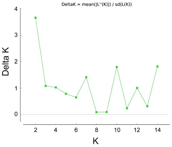 Best K value determination using the STRUCTURE harvester. One hundred thousand simulations after burn-in of 100,000 simulations were performed for the ΔK (delta K) method. Three independent runs in the range of 2 to 14 possible clusters were obtained by the simulations. The highest delta K value was achieved with a K of 2.