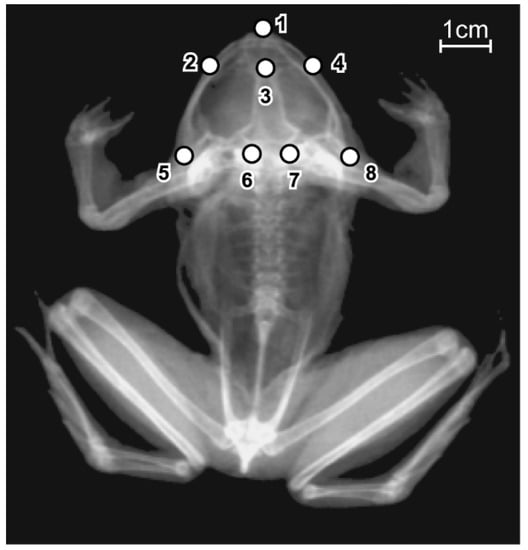 X-ray body image of a black-spotted pond frog obtained by a dual-energy X-ray absorptiometry (DEXA). Eight landmark points characterize the skull shape: (1) the posterior tip of the premaxilla, (2) the left tip of the maxilla, (3) the anterior tip of the sphenethmoid, (4) the right tip of the maxilla, (5) the left tip of the quadrate, (6) the right tip of the quadrate, (7) the posterior left tip of the prootic, and (8) the posterior right tip of the prootic.