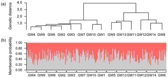 Genetic distance and population genetic structure of 210 black-spotted pond frogs from 14 sub-watershed areas: (a) unweighted pair group method with arithmetic mean (UPGMA) tree with Euclidean distance; (b) population genetic structure provided by STRUCTURE analysis.
