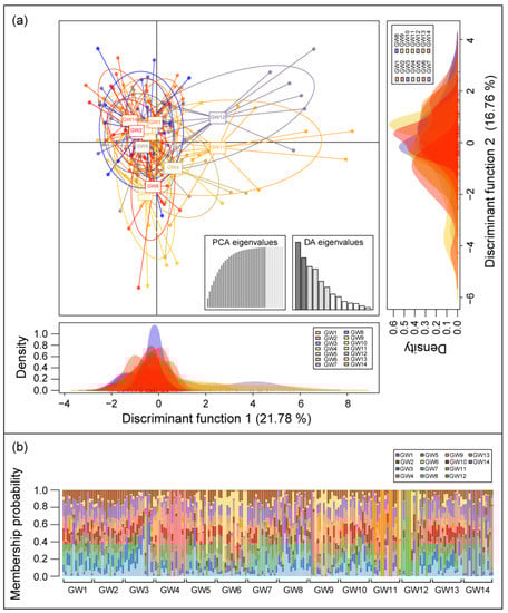 Population genetic structure based on discriminant analysis of principal components (DAPC): (a) scatter plot based on two major discriminant functions (DF). DF1 explained 21.78% of the genetic variation in black-spotted pond frogs, while DF2 explained 16.76%. Each node represents the genotype of frogs connected to a centroid assigned based on the clustering of the DAPC scores; (b) membership probability of DF determined that the sampled frogs were optimally clustered into 14 sub-watershed areas.