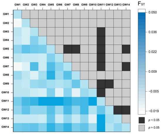 Based on paired FST, the GW11 population was genetically significantly distant from the eight populations (GW3, GW4, GW6, GW7, GW9, GW10, GW13, and GW14), indicating that it was the most genetically distant group (Figure 7). Additionally, GW4 and GW14 were genetically significantly distant from the four groups, although no specific pattern was found.