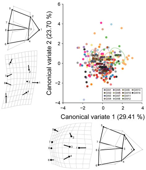 The skull shape variation among frogs collected from 14 sub-watershed areas determined by performing canonical variate analysis (CVA). The scatterplot consists of two major canonical variates (CV). CV1 and CV2 explained 29.41% and 23.70% morphological variation, respectively in frogs from 14 sub-watershed areas. Circles in the deformation grids and the black wireframe graphs indicate the skeletal shape of the individuals with the lowest CV values. Sticks in the deformation grids and the gray wireframe graphs indicate the change of skeletal shape with increasing CV value.