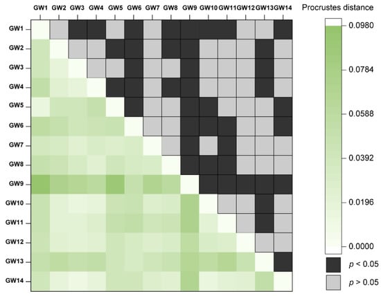 A heatmap showing Procrustes distance among frogs obtained from 14 sub-watershed areas. The green boxes indicate Procrustes distance values. Dark gray colored boxes indicate significant difference of Procrustes distance from CVA between two groups, whereas light gray colored boxes indicate the non-significant difference of Procrustes distance from CVA between two groups.