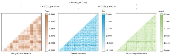Based on the geographical distances among the 70 collection sites, the Mantel test revealed no significant (p > 0.05) genetic isolation (Figure 10). Moreover, genetic distance did not correlate with morphological distance (p > 0.05), but morphological distance and geographic distance were strongly correlated (Mantel statistic, r = 0.160, p < 0.05).