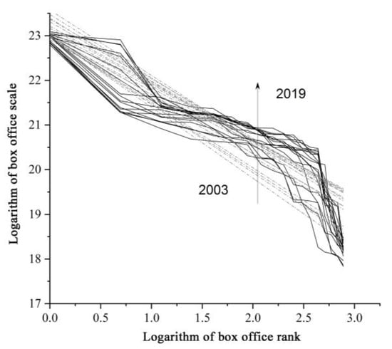 Logarithmic curve of rank scale of box office distribution of G20 films from 2003 to 2019.