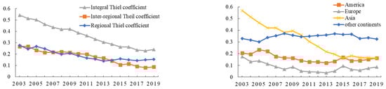 From 2003 to 2019, the overall Theil coefficient, interregional Theil coefficient, and intraregional Theil coefficient of G20 film box office with a fluctuating downward trend indicate that the overall, inter-regional, and intra-regional box office differences of G20 were decreasing year by year. It can be further inferred that the competition in the G20 film box office market and the prosperity of the global film box office market became fiercer. To some extent, the occurrence of such changes indicates both economic globalization and cultural globalization [30]. Meanwhile, the contribution rate of the Theil coefficient within each region increased steadily and the contribution rate of between-region differences to the Theil coefficient gradually decreased. The regional differences have become the dominant reason affecting the overall differences in recent years.