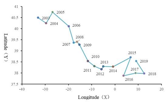 The center of gravity for box office revenue captures the geographical center of the revenue distribution and its spatial aggregation. The geographical transfer of the center of gravity follows the track created by movements in the center of gravity of the G20 film box office and also reflects changes in the direction of film box office revenue flows [31].