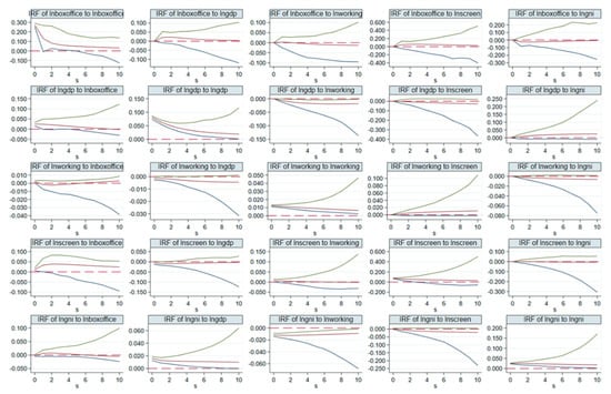 The impulse effect of the box office of G20 countries on the impact of various influencing factors. Note: The horizontal axis indicates the number of lags in the effect of the shock, the vertical axis indicates the change in the explanatory variable, the red line in the middle indicates the impulse response function, and the blue and green lines on either side indicate the positive and negative two times standard deviation bands. The red line, indicates how the explanatory variable changes after giving a shock to the explanatory variable and the effect of the shock on a variable at different periods.