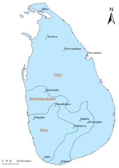 Sample collection sites with their three climatic zones in Sri Lanka.