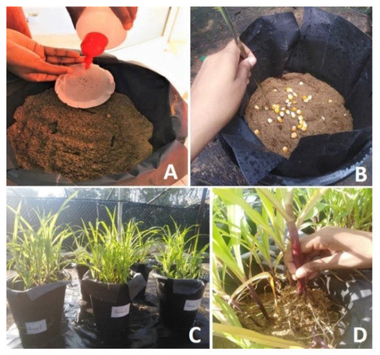 Established trap culture for single species AMF isolates using maize plants as hosts. (A) Introduction of the single-species AMF spores to the pot; (B) Application of the maize seeds to the top of the AMF spores after one day; (C) Two-week-old maize plants; (D) Collection of the AMF-trapped one-month-old maize roots.
