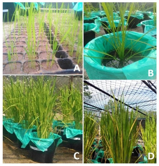 Different growth stages of the cultivated rice plant in the pot experiment (Bg350 variety). (A) Ten-day-old rice plantlets after sowing; (B) Three-week-old rice plants; (C) Six-week-old rice plants; (D) Nine-week-old rice plants.
