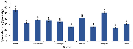 Arbuscular mycorrhizal fungi spore density (Spores/g) of different paddies in dry, wet, and intermediate zones in Sri Lanka. (Dry zone: Jaffna, Anuradhapura, Vavuniya, and Trincomalee; intermediate zone: Kurunegala, Badulla, and Matara; wet zone: Kandy, Gampaha, Rathnapura, and Galle). a–c indicates the significant difference between each district (Tukey pairwise comparison).