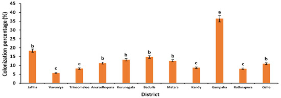 Colonization (%) variation of AMF among different paddies in dry, wet, and intermediate zones in Sri Lanka. (Dry zone: Jaffna, Anuradhapura, Vavuniya, and Trincomalee; intermediate zone: Kurunegala, Badulla, and Matara; wet zone: Kandy, Gampaha, Rathnapura, and Galle). a–c indicates the significant difference between each district (Tukey pairwise comparison).
