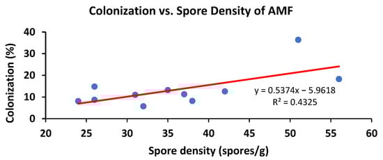 Relationship between AMF spore density in soil and colonization of AMF in rice roots in the different sampling sites of paddies (p ≤ 0.05).