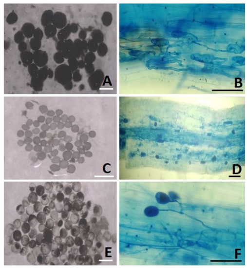 The paddy soil-adapted single species AMF spore isolates and their colonization patterns in one-month-old maize plant roots. (A) Spores of Glomus sp.; (B) Colonization patterns of Glomus sp. in maize roots.; (C) Spores of Claroideoglomus sp.; (D) Colonization patterns of Claroideoglomus sp. in maize roots; (E) Spores of Aculospora sp.; (F) Colonization patterns of Aculospora sp. in maize roots. Scale Bars: (A,C,E) = 100 μm and (B,D,F) = 50 μm.