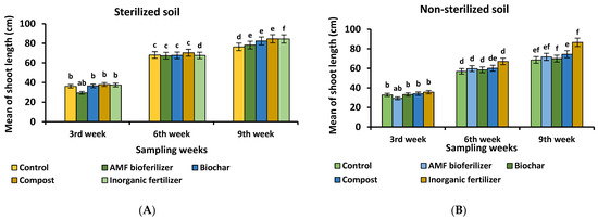 Mean values of shoot length according to different fertilizer applications at 3, 6, and 9 weeks after sowing rice seeds. (A) Rice plants are grown under sterilized soil conditions; (B) Rice plants are grown under non-sterilized soil conditions. Values are the means ± standard errors calculated from four replicates. a–f indicates the significant difference between each fertilizer treatment. (Tukey pairwise comparison).