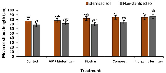 Mean values of the shoot length according to different fertilizer applications under sterilized and non-sterilized soil conditions at 9 weeks after sowing the rice seeds. Different letters above the columns indicate significant differences at the level of 0.05. Values are means ± standard errors. x/y indicates the significant difference in soil type, and a/b indicates the significant difference fertilizer treatments (Tukey pairwise comparison).