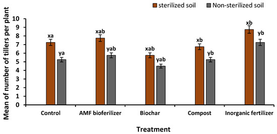 Mean values of the number of tillers per rice plant according to different fertilizer applications under sterilized and non-sterilized soil conditions at 9 weeks after the sowing of the rice seeds. Different letters above the columns indicate significant differences at the level of 0.05. Values are means ± standard errors. x/y indicates the significant difference in soil type, and a/b indicates the significant difference in fertilizer treatments (Tukey pairwise comparison).
